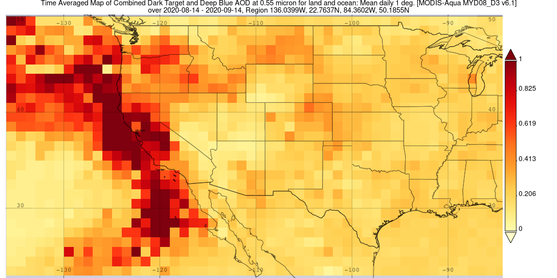 Average Aerosol Optical Depth over the Western United States for August 14 - September 14, 2020.