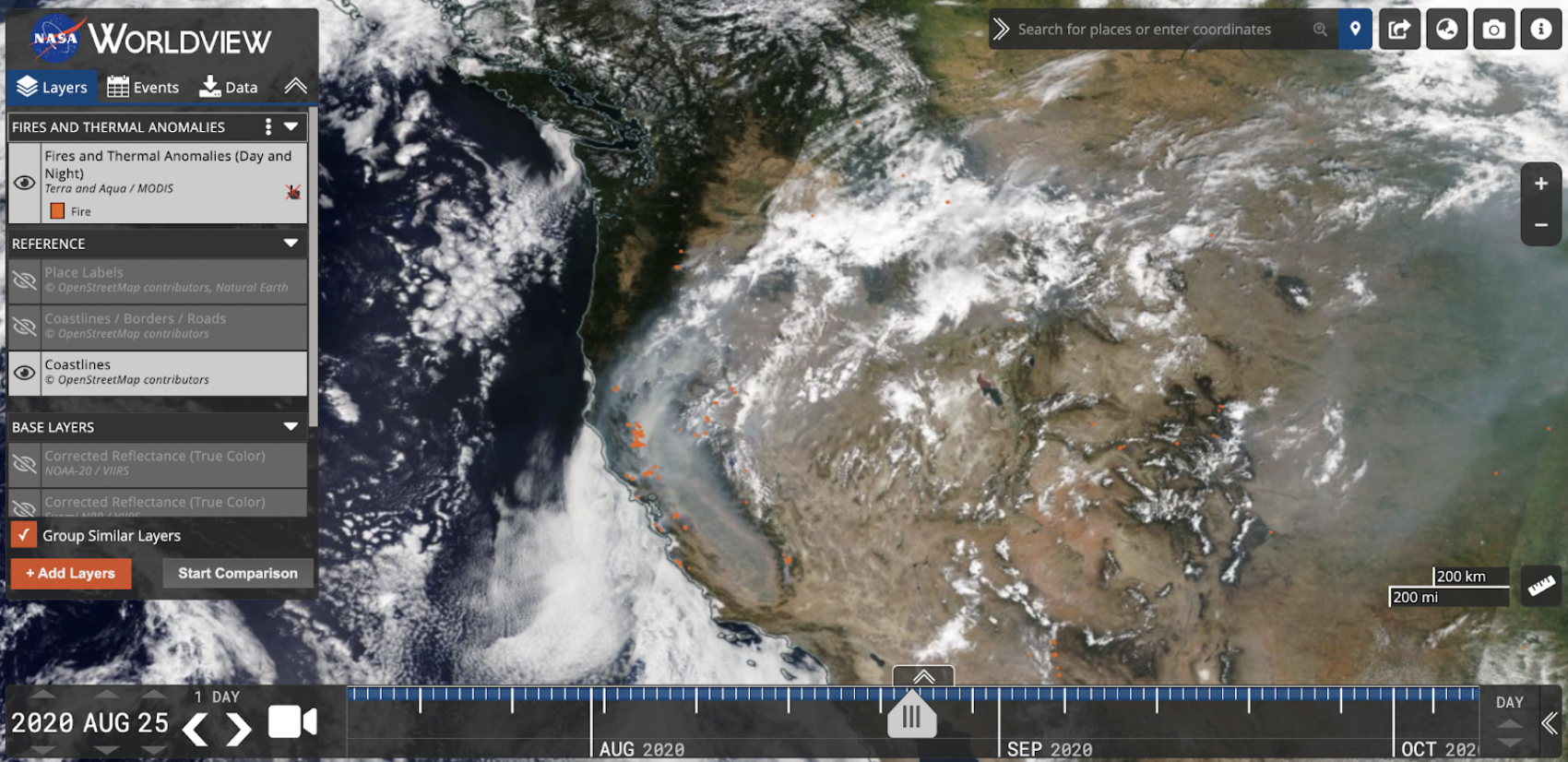 Satellite imagery from August 25, 2020, combined with identified instances of fire, shows us visibly high levels of Smoke sitting over California.